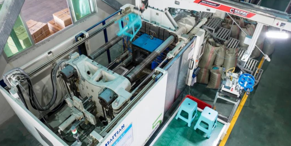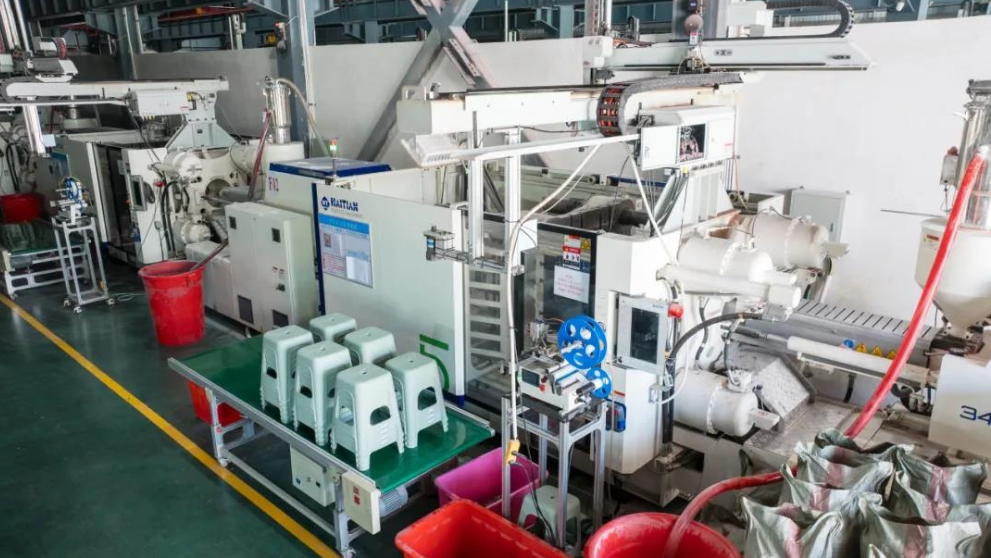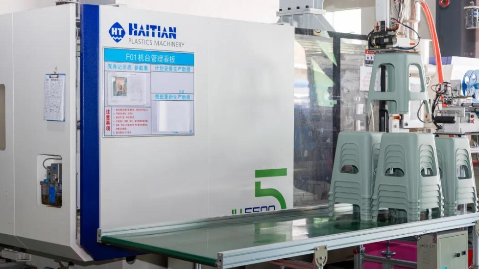 踏进蓝天厂房,122台海天注塑机阵列排开,紧张而有序地工作着。每台注塑机都以其卓越的性能,讲述着蓝天对产品质量和生产效率的执着追求。其中,最新引进的海天JU第五代注塑机尤为引人注目。在JU五代机的高效运作下,一把把椅子精准成型,光滑脱模,生产如行云流水。