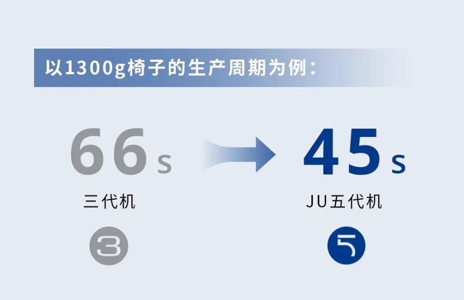 经过一年来的使用和精密测试,蓝天杨谋略告诉我们:“同样为1300克的椅子,在三代机生产需要66秒,而JU五代机的生产周期可以达到45秒左右。”