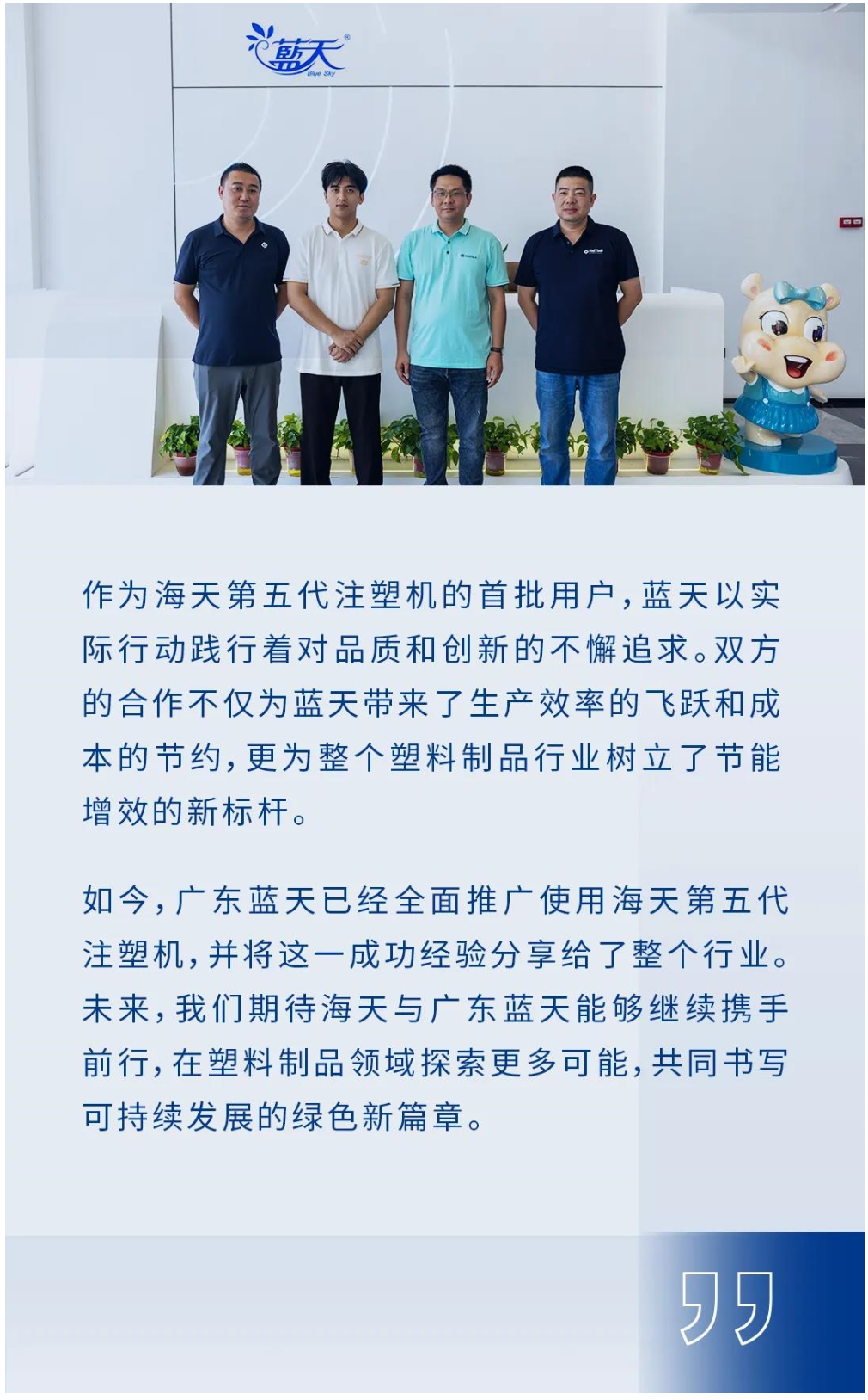 作为海天的长期合作伙伴,多年来,蓝天塑料对海天的产品质量和技术创新有着充分的信任。因此,在海天推出第五代技术之初,蓝天便毫不犹豫地选择率先拥抱这一全新技术,以前瞻性的视野,开启了节能增效的新篇章。