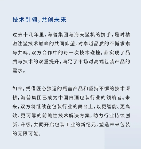 随着数字化、智能化、自动化时代的到来,海普与海天的合作也迎来了新的机遇。海普希望未来在设备的数智化方面进一步提升,实现与海普内部信息系统的更好对接与配合。而海天智联积极响应了这一需求,为海普集团提供更加智能化、自动化的一站式解决方案,助力海普在瓶盖包装领域实现更大的突破。
