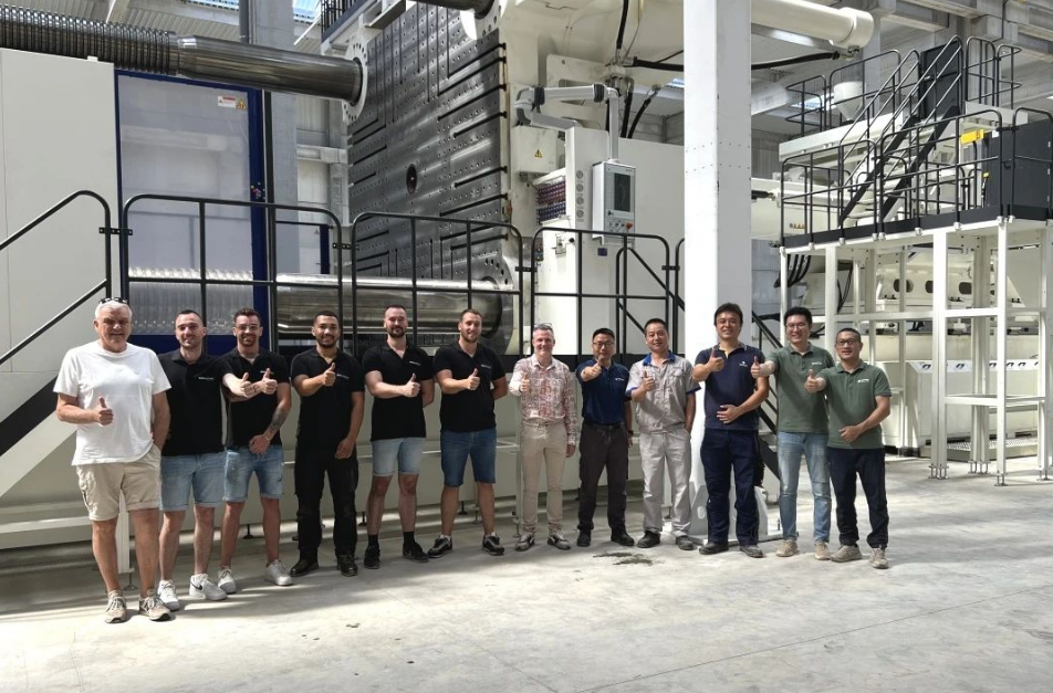 抵达法国后,海天立即组织专业的技术团队前往客户工厂,迅速投入到紧张的安装调试工作中。共计9名工程师,经过5周时间的连续奋战,海天8800T终于在法国客户的工厂内成功启动并稳定运行,应用于包装和家居用品的生产。从机器的拆解、组装到生产调试,每一个步骤都严谨有序、精准无误。整个过程中,海天团队与法国客户保持着紧密的沟通与协作,双方共同见证了这一重要的交付时刻。