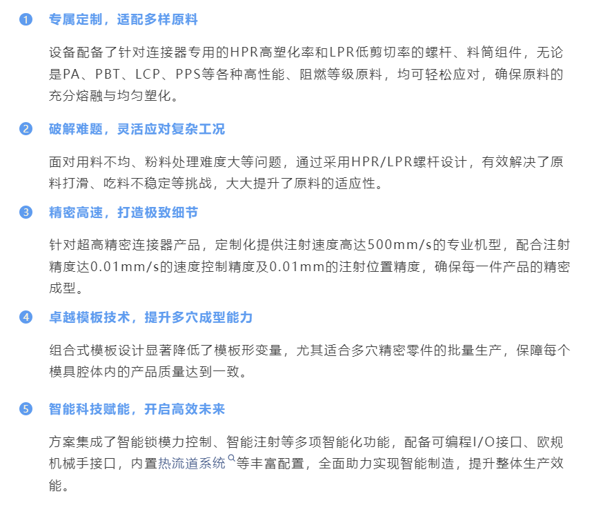 长飞亚连接器专用解决方案以匠心独运的设计理念和技术实力,不断刷新连接器注塑生产的高标准,引领行业向更精密、更高效的方向迈进。让我们共同见证,在长飞亚的技术力量下,每一个微小的连接器都将为构建未来世界的智慧网络添砖加瓦,书写精密高效的全新篇章!
