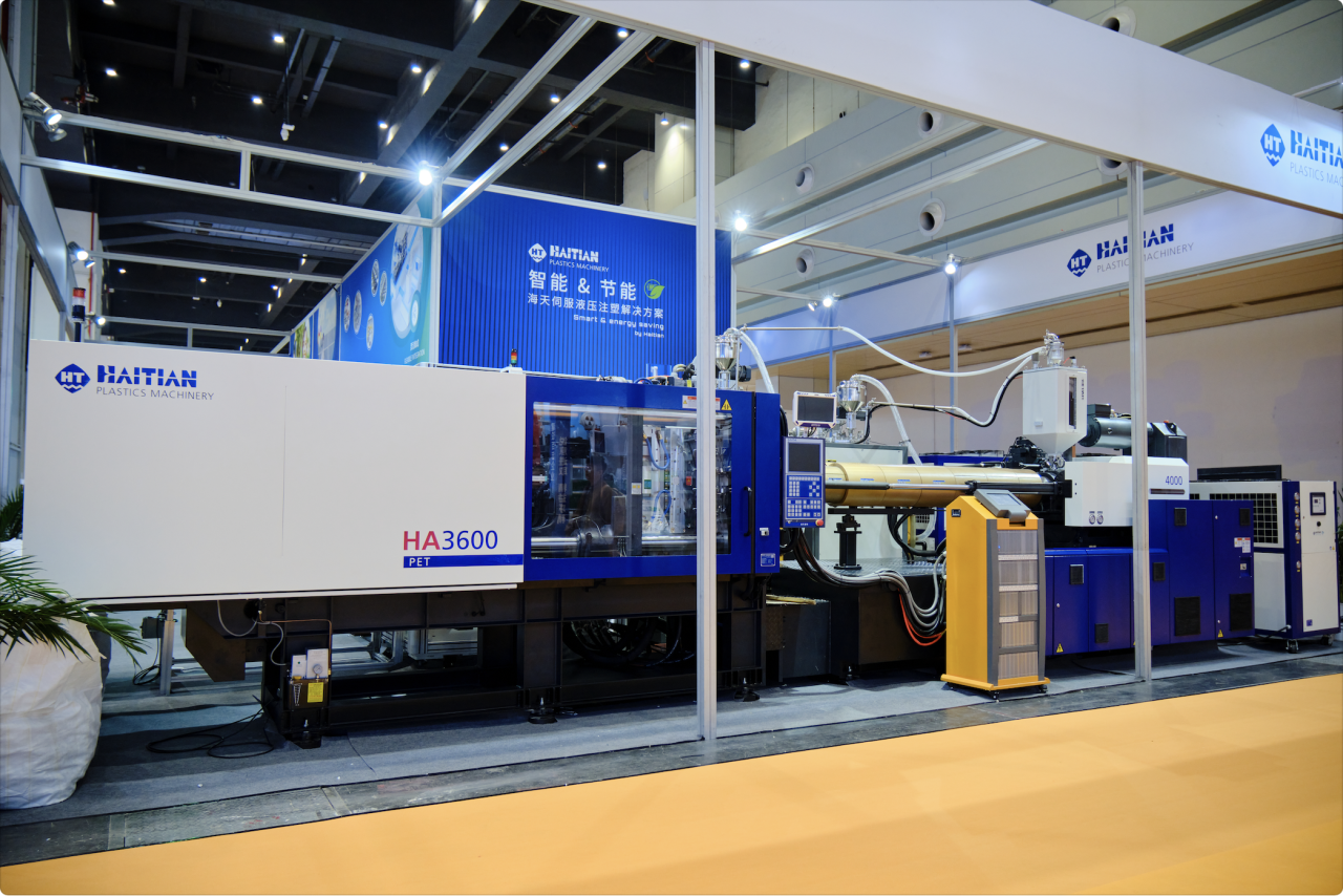 海天HA3600/4000PET-C包装行业解决方案,搭配侧取机械手取件,现场演示瓶胚制品的注射成型。整套方案以更高性能、更高效率以及智能化、低能耗设计,为包装行业客户的高效、绿色生产持续赋能。